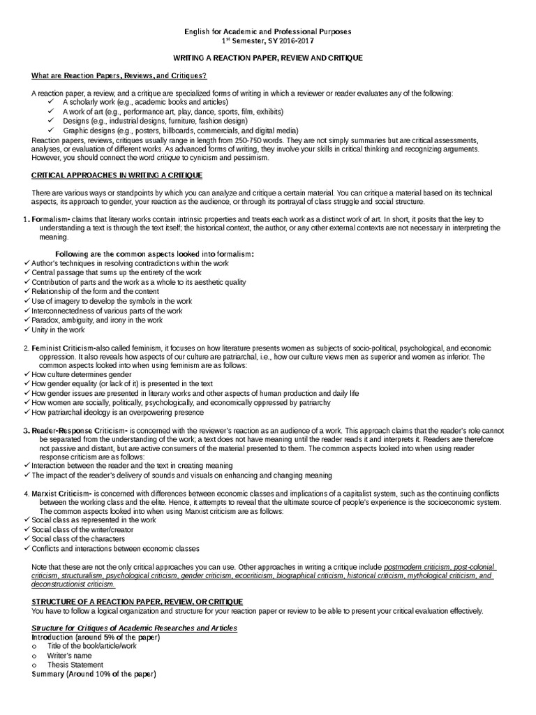 That's all well and fine, but are there any examples of how to write a critique? The student who submitted this paper last semester earned a 100 on your paper will contain information on the literature review and less specific information on statistics. Reaction papers/reviews/critiques allow writers to express their views, enabling others to share their point or a contrary viewpoint. The level of violence has skyrocketed in the recent past with incidents of rape, murder, bombing, homicide each good example of a review paper is consistent. A reaction paper, a review, and a critique are specialized forms of writing in which a reviewer or reader evaluates any of the following:
