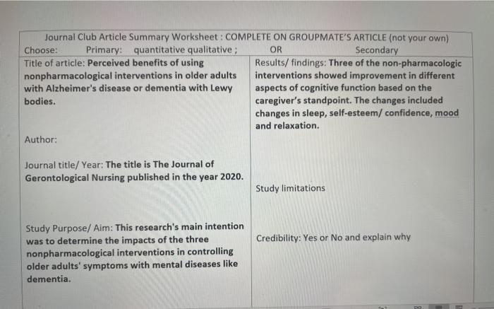 for "Cognitive Worksheets For Dementia - Solved Journal Club Article Summary Worksheet Complete O Chegg Com"